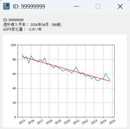 さらに、回帰直線も描画し、透析導入予測時期を計算します。これにより、患者の腎機能を一目で把握し、治療計画を立てるのに役立ちます。